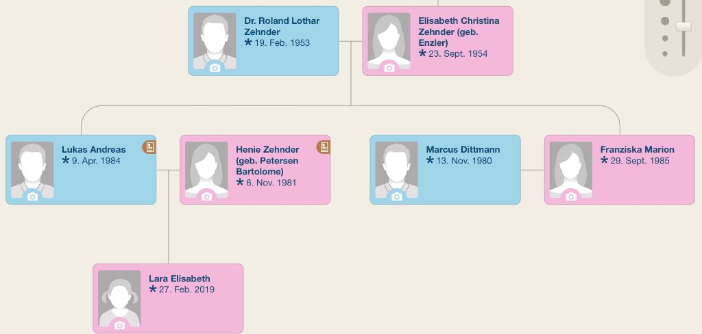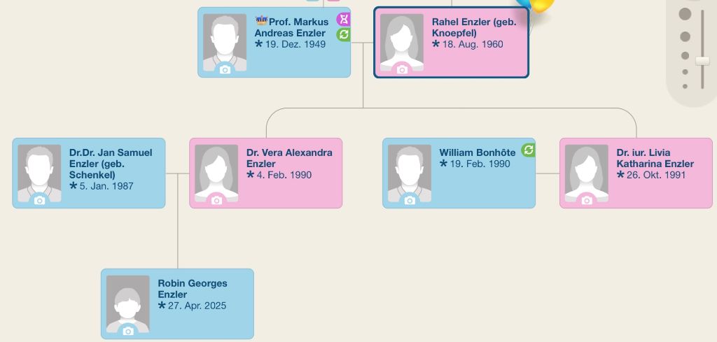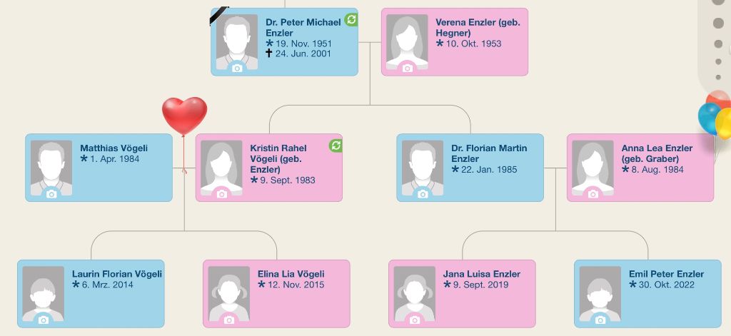 Die Familien meiner Grosseltern, meiner Geschwister sowie meine eigene habe ich mit Hilfe der Website „Myheritage“ gestaltet. Allerhand Firlefanz wie Herzchen oder Luftballons soll auf nahende Jubiläen hinweisen. Leider konnte ich diese nicht zum Verschwinden bringen, ebensowenig ein albernes Krönchen neben meinem Namen.