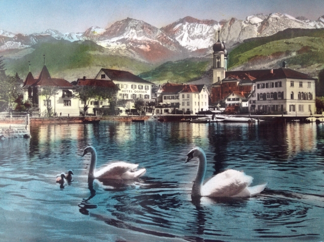Der Witwer kam gerne nach Lachen zu Besuch, meistens mit der Haushälterin Anneli, die wir auch alle lieb hatten. Beide genossen die Küche von Mama Friedel. Mehrmals verbrachten wir Kinder Ferien in Altstätten, meistens zu zweit. Am häufigsten waren meine Schwestern dort, denn Grosspapi war geradezu vernarrt in sie, vor allem die strohblonde Franziska hatte es ihm angetan. Ich war allein oder mit einem der Brüder in Altstätten in den Ferien. Manchmal spielte Grosspapi Klavier und sang dazu, beispielsweise das Appenzeller Landsgemeindelied "Alles Leben strömt aus Dir...".